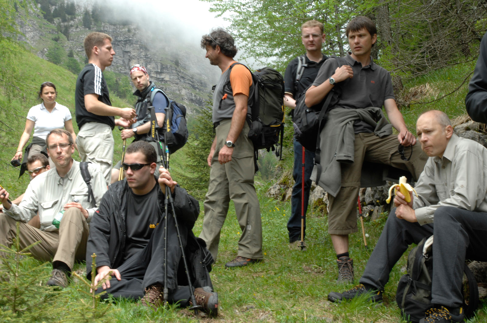 31. Mai 2008. Gipfeltag. Der Berg ruft! Die Nacht war kurz. In Bussen wurde das 35-köpfige Expeditionsteam in aller Frühe weitere 32 km zum Startpunkt transportiert. Auf ca. 1.700 Höhenmetern begann der tatsächliche Aufstieg. Das Protokoll schrieb 09:00 Uhr. Ausgestattet mit Wanderstock und Jause machte sich ein jeder auf den Weg. Die Route führte die PROMOS Bergsteiger vorbei an sensationellen Landschaften, rauschenden Bächen, seltenen Pflanzen und pfeifenden Murmeltieren.