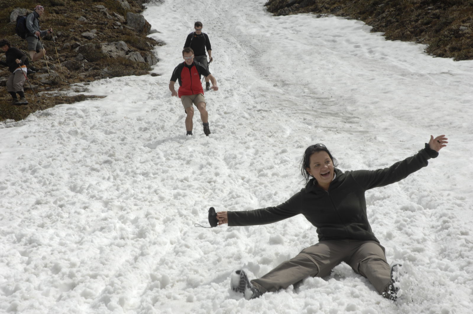 ![]() Höher, schneller, weiter? Höher als bis zum Gipfel konnte das Team nicht aufsteigen. Weiter blicken als bis zum Horizont war unmöglich. Blieb nur noch ein schneller Abstieg: Wie hätte das besser gelingen können, als mit einer Rutschpartie im Schnee? |