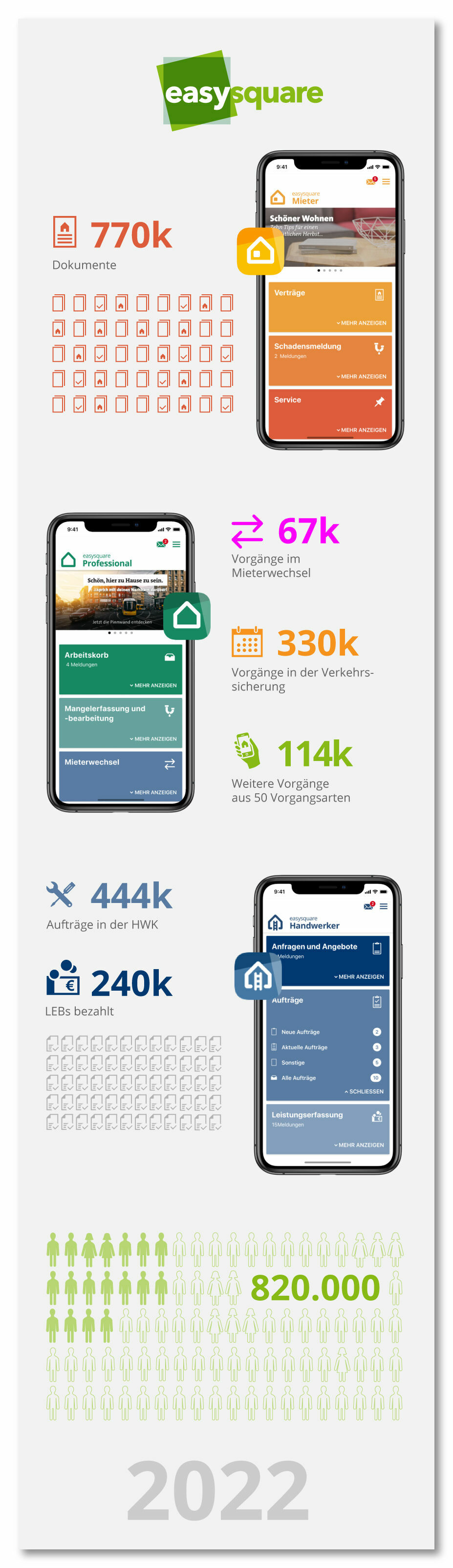 Mit unseren App-basierten 360-Grad-Lösungen von easysquare geben wir den Unternehmen der Immobilien- und Wohnungswirtschaft die perfekten Tools an die Hand, um die Servicequalität für ihre Kunden zu erhöhen. Die Zettelwirtschaft wird abgeschafft, Anrufe werden reduziert und gleichzeitig steigen Erreichbarkeit sowie die Transparenz in der Kommunikation durch Kunden-Apps und Co. Und die Nachfrage steigt. Mit dem rasanten Anstieg der Userzahlen von etwa 200.000 neuen Registrierungen auf der easysquare Plattform insbesondere in der Gruppe der Mieter und Interessenten zeigt sich, dass unsere Kunden im Ausbau ihrer digitalen Lösungen auch hier die Nase vorn haben. Mieterzufriedenheit, Effizienz und Entlastung der Mitarbeitenden – besser geht's nicht! Und wie gut das Angebot angenommen wird, dazu sprechen die Zahlen eine deutliche Sprache: Über 770.000 Dokumente wurden in diesem Jahr über unsere Kunden-Apps zugestellt.