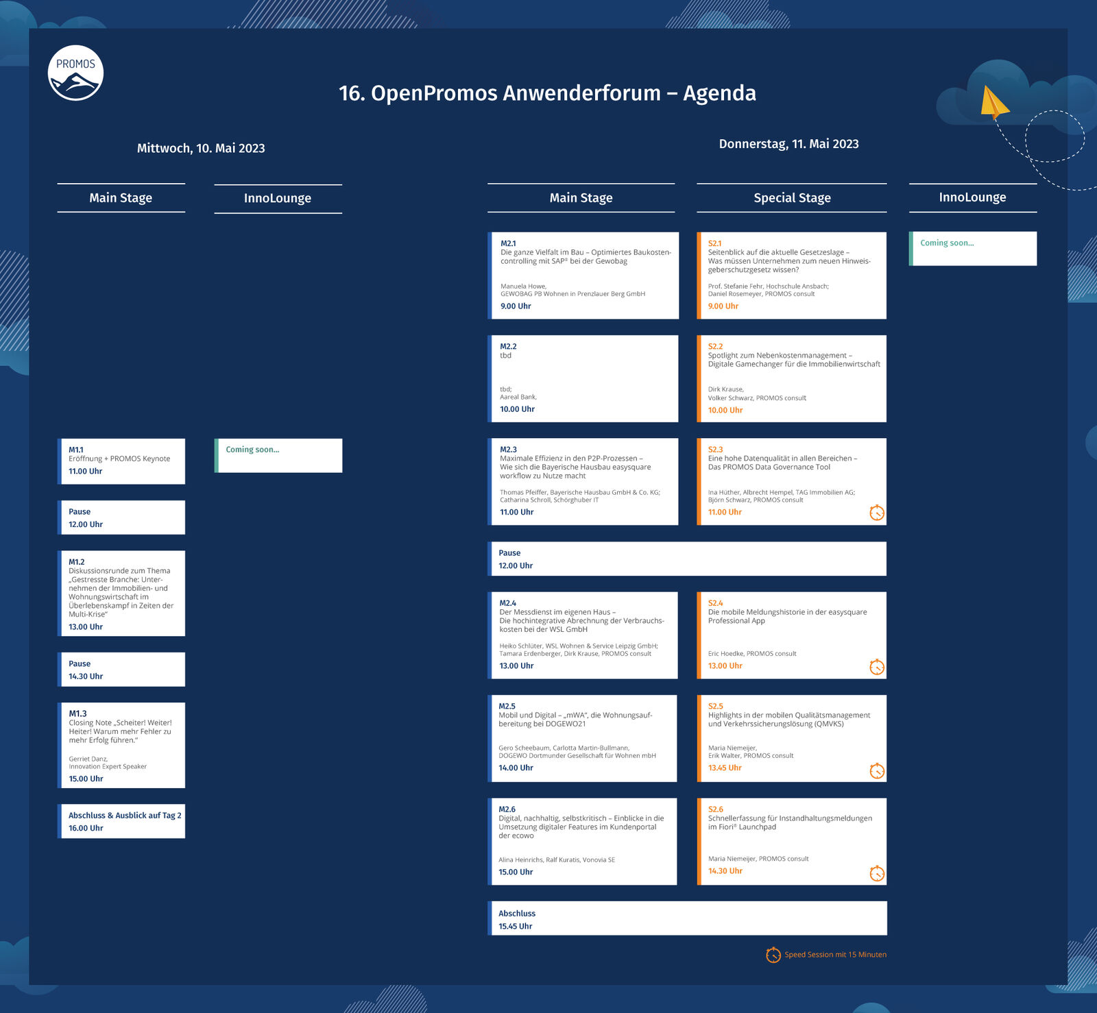 Am zweiten Veranstaltungstag widmen wir uns den Erfolgsgeschichten aus der Praxis. Unternehmen der Immobilien- und Wohnungswirtschaft berichten über ihre Erfahrungen aus den vielfältigsten Digitalisierungsprojekten. So wird unter anderem die Bayerische Hausbau darüber sprechen, wie sie sich easysquare workflow für ihren Bestell-, Nachtrags- sowie Rechnungsprozess in SAP® zu Nutze macht. Von der WSL Wohnen & Service Leipzig GmbH lernen Sie, wie eine hochintegrative Abrechnung der Verbrauchskosten Zeit und Arbeit sparen kann. Und in ihrem Slot zum ecowo Kundenportal gibt uns das Unternehmen Einblicke in ihre Erfahrungen mit dem Onboardingprozess für Eigentümerinnen und Eigentümer. Außerdem berichten sie, wie sie mit der digitalen Belegprüfung und Zustellung von Dokumenten nicht nur auf Papier verzichten, sondern auch von automatisierten Workflows profitieren. Ein weiterer Grund von vielen, weshalb nicht nur wir, sondern auch innovative Immobilienunternehmen auf Digitalisierung fliegen!