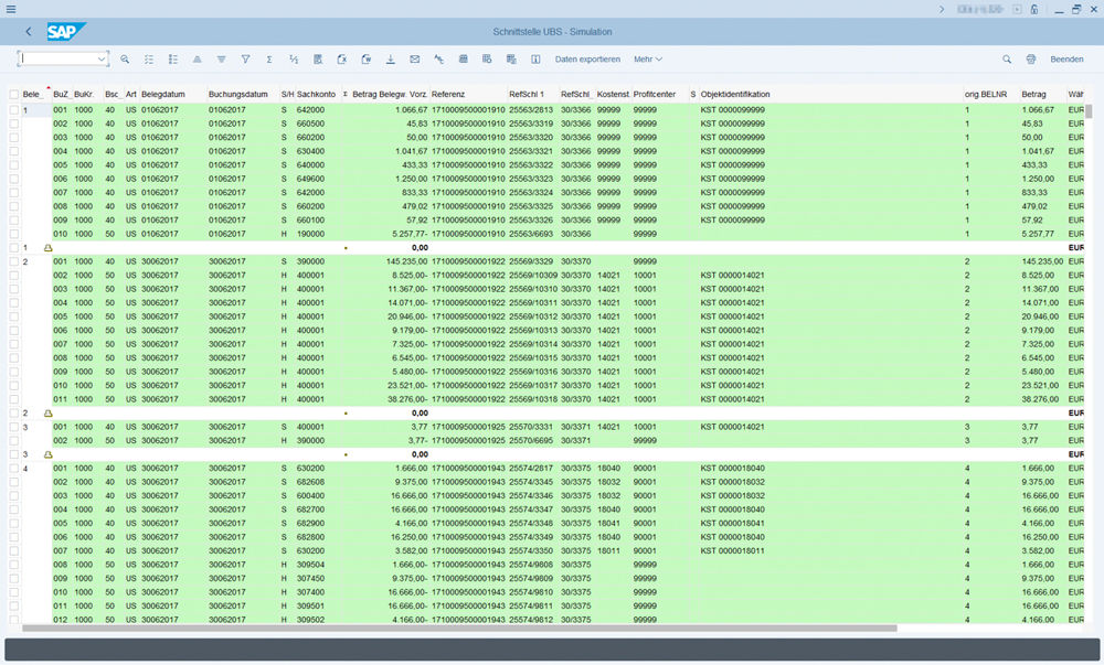 Die zu übertragenden Daten werden zunächst nach einer individuell definierbaren Logik als strukturiertes Dateiformat (XLS, CSV etc.) eingepflegt. Durch diese Aufbereitung der Daten kann eventuellen Fehlern bei der Übertragung vorgebeugt werden. Zusätzlich kann die Eingangsdatei mittels der Universalbuchungsschnittstelle auf mögliche Fehler überprüft werden. Bei dieser Simulation wird kontrolliert, ob alle Mussfelder der Datei mit Werten befüllt sind bzw. korrekt gemappt worden sind, wie zum Beispiel die Überleitung einer externen Kontonummer in die SAP Kontennummer. Im Simulationsergebnis gibt eine Liste ggfs. über die festgestellten Fehler Auskunft.