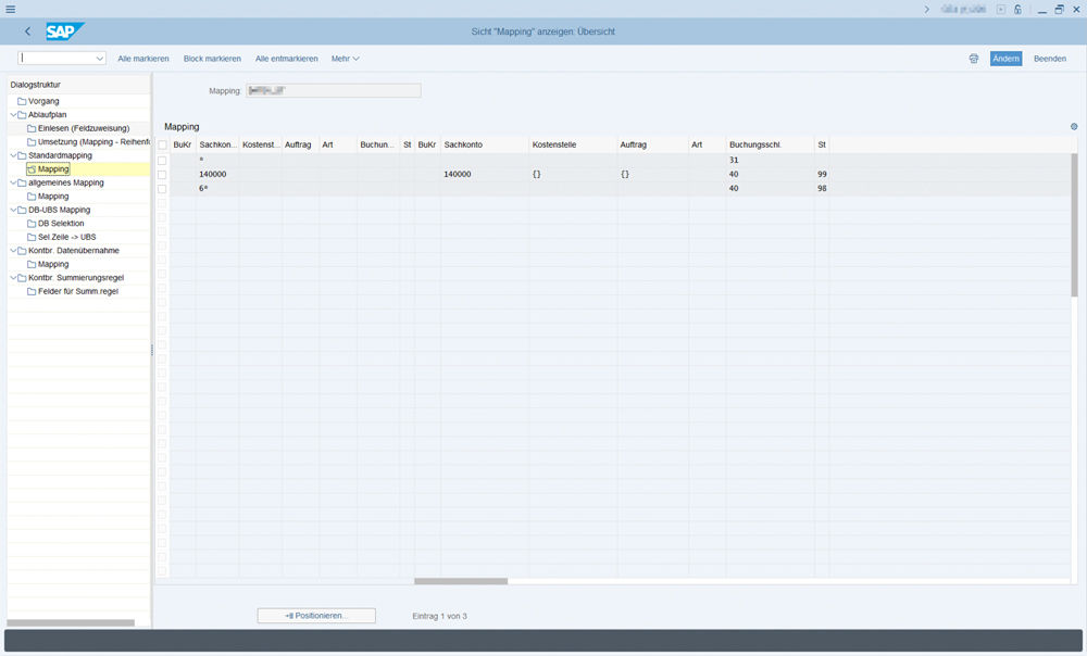 - Customizing: Eine separate Transaktion erlaubt das Customizing, welches die Grundlage für die Nutzung bzw. automatische Verbuchung bildet. Im Customizing wird das Mapping für den Buchungsstoff vorgegeben.