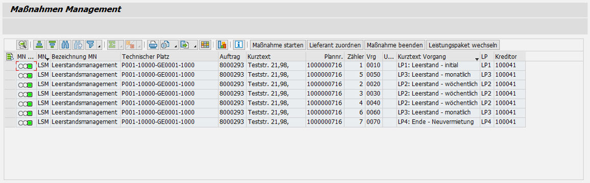 Mit der Funktion „Leerstandsmanager“ werden Aufträge zu den Leistungspaketen generiert. Erst, wenn die Leistungen „endrückgemeldet“ sind, wird das nächste Leistungspaket generiert. Mit dieser Funktion kann zu den einzelnen Wohnungen der Stand der Maßnahmen, also welches Leistungspaket gerade bearbeitet wird, übersichtlich dargestellt werden.