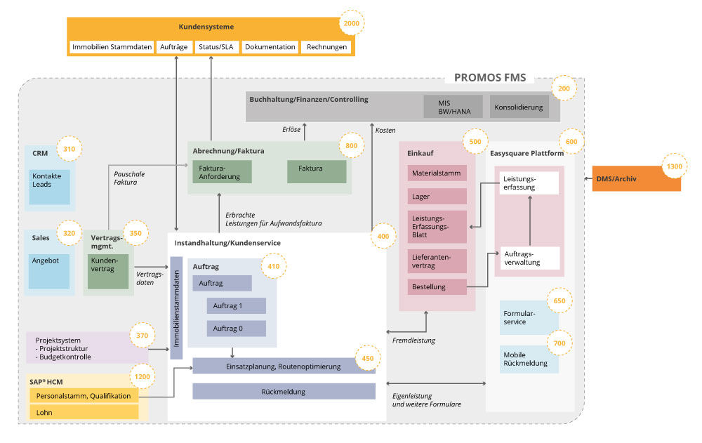 Um nie den roten Faden zu verlieren, hat PROMOS ein SAP®-basiertes Workforcemanagementsystem als Plattform entwickelt, auf dem die Akteure die Prozesse reibungslos ausführen können. Hierfür stehen dem Kunden Funktionalitäten aus den SAP® Modulen PM, CS, MM, FI, CO, PS, SD, MRS und RE-FX zur Verfügung. Der Funktionsumfang ermöglicht die Durchführung und Auftragsverwaltung geplanter / ungeplanter Aufträge im Servicemodul, die Beschaffung von Material und Fremdleistungen im Einkaufmodul, die Vergabe von Aufträgen an Lieferanten und Fremddienstleister über das easysquare Lieferantenportal bis hin zur vollautomatischen Disposition und Anbindung mobiler Arbeitsschritte mit easysquare mobile sowie die Rechnungsstellung an den Kunden.