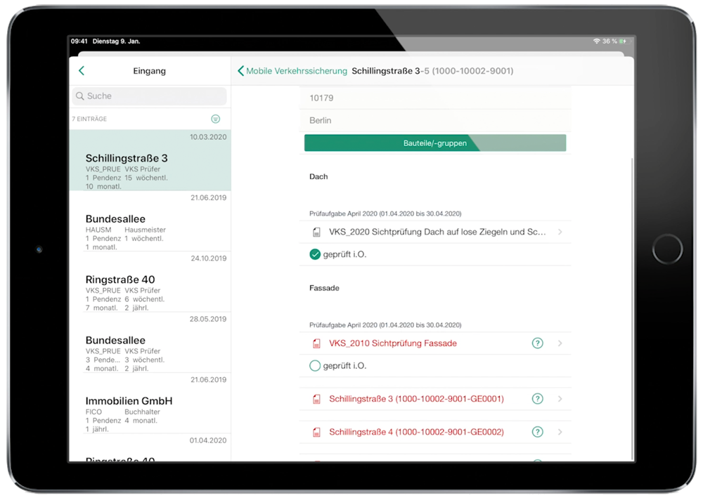 Der Prüfer erhält vom easysquare Webportal seine Prüfaufgaben als digitale Formulare in seiner easysquare Professional App. Diese beinhalten die Adresse des Prüfobjekts sowie eine genaue Aufgabenbeschreibung. Mithilfe von Auswahlkatalogen, Infofeldern sowie farblich markierten Pflichtfeldern wird der Prüfer durch die Formulare geleitet. Eventuelle Mängel können erfasst und mittels der Fotofunktion dokumentiert werden. Abschließend sendet der Prüfer das digitale Formular an das easysquare Webportal des Eigentümers. Das automatisch generierte PDF-Prüfprotokoll dient als Nachweisdokument.