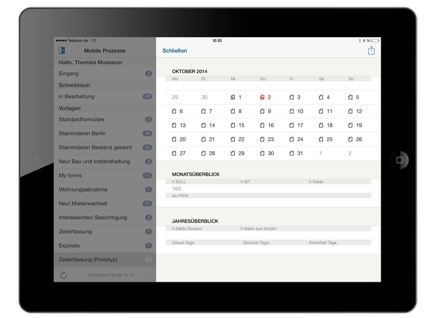 ![]() Kalendersicht zur Zeiterfassung: Der Mitarbeiter wird intuitiv durch die Anwendung geführt. |