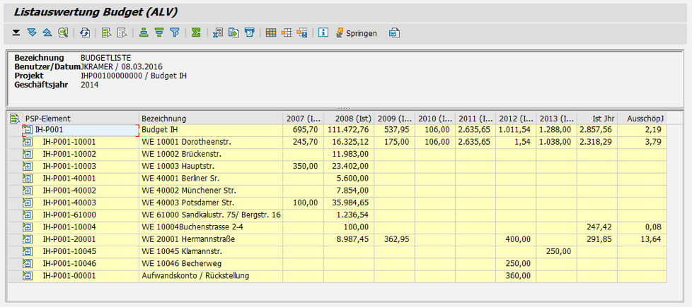 Die Ergebnisliste zeigt je PSP-Element bzw. optional je Instandhaltungsauftrag eine Zeile an. Hierbei ist es möglich, in die Einzelpostenlisten abzuspringen. Die Auswertung greift auf Summensätze zu, sodass insbesondere große Projekt mit vielen Belegen, wie es beispielsweise bei Instandhaltungsbudgets der Fall ist, performant ausgewertet werden können.