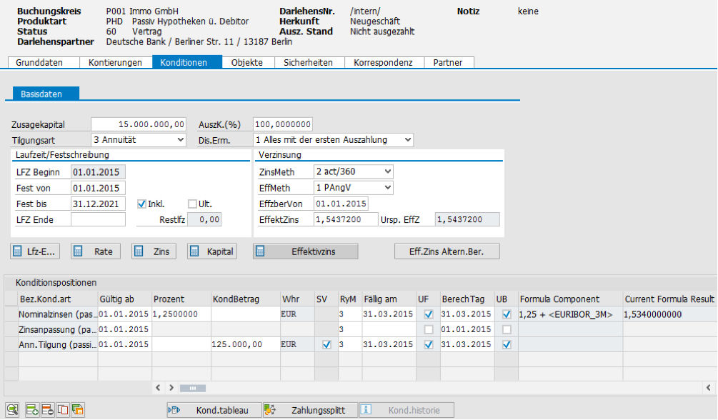 Die Abbildung von Darlehensverträgen und den teilweise sehr komplexen Vertragskonditionen der kontrahierenden Banken in ERP-Systemen erfordert nicht selten eine sehr detaillierte Kenntnis der Vertragsstrukturen. Im SAP® ERP-System werden die Vertragsinformationen im Modul Darlehensverwaltung (FS-CML) in einer Anwendung einmalig hinterlegt und können dann automatisch periodisch verarbeitet und gebucht werden.