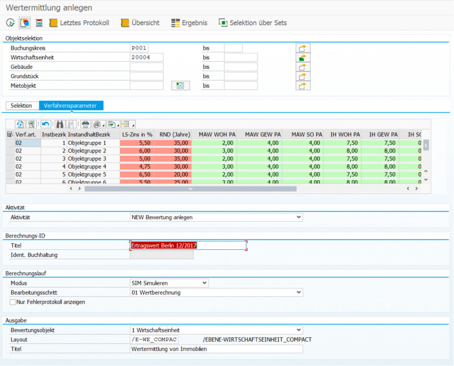 Über die Definition der Verfahrensparameter und der automatischen Ermittlung des Beleihungswertes hinaus stehen nachfolgende Funktionen in der Lösung bereit: Zum einen wird Ihnen in der Selektionsmaske die Objektauswahl zum Bewertungsstichtag bereitgestellt. Zum anderen werden die ermittelten Immobilienwerte automatisiert und zeitabhängig zur Wirtschaftseinheit als Bemessung im ERP fortgeschrieben. Auf diese Weise haben Sie in den Stammdaten schnell Zugriff auf die wichtigsten Kennzahlen, da die ermittelten Beleihungs- und Ertragswerte sowie deren Berechnungsgrößen in der Datenbank zur Verfügung stehen.