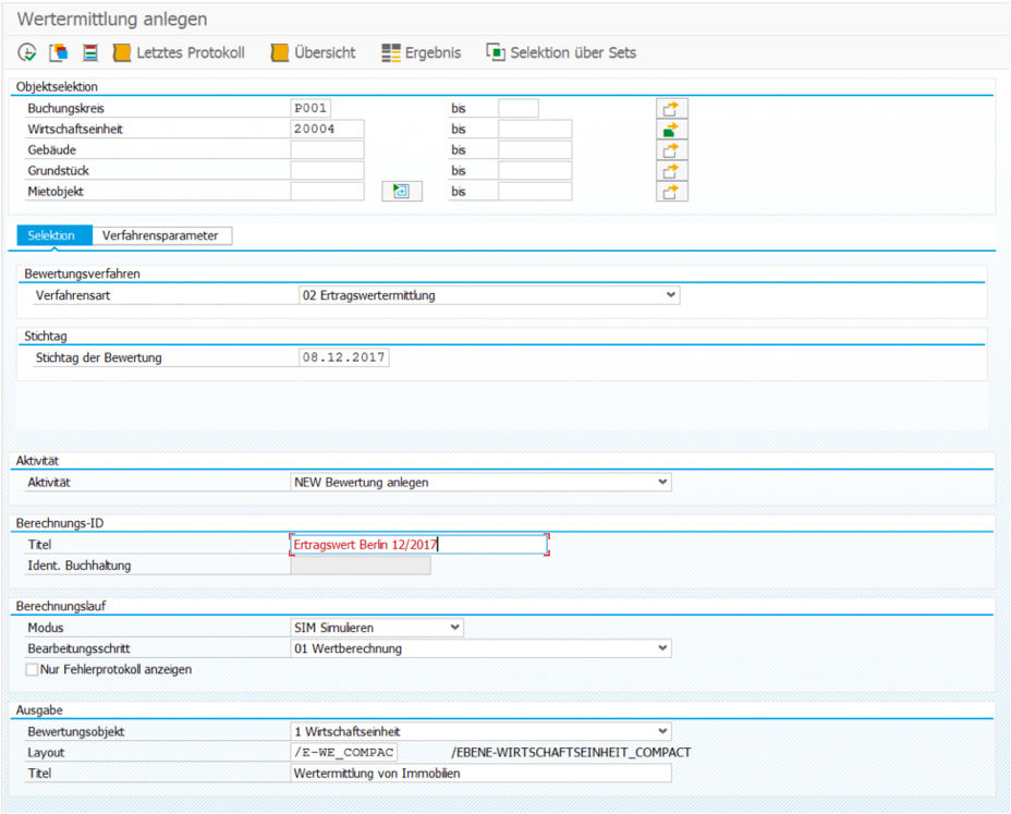 Über die Definition der Verfahrensparameter und der automatischen Ermittlung des Beleihungswertes hinaus stehen nachfolgende Funktionen in der Lösung bereit: Zum einen wird Ihnen in der Selektionsmaske die Objektauswahl zum Bewertungsstichtag bereitgestellt. Zum anderen werden die ermittelten Immobilienwerte automatisiert und zeitabhängig zur Wirtschaftseinheit als Bemessung im ERP fortgeschrieben. Auf diese Weise haben Sie in den Stammdaten schnell Zugriff auf die wichtigsten Kennzahlen, da die ermittelten Beleihungs- und Ertragswerte sowie deren Berechnungsgrößen in der Datenbank zur Verfügung stehen.