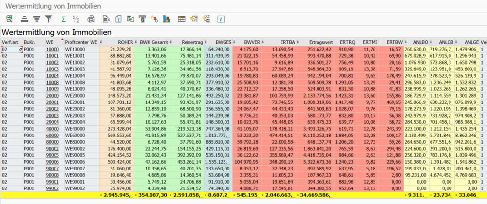 - Ergebnisliste: Der ALV zur Wertermittlung ermöglicht u. a. die Bildung von Summen und Zwischensummen sowie das Filtern und Sortieren. Des Weiteren ist ein Export nach Excel möglich. In Abhängigkeit der Verdichtungsebene ist aus dem ALV heraus ein Absprung in die Wirtschaftseinheit, Gebäude / Grundstücke oder Mietobjekte möglich. Zur Gegenüberstellung der Immobilienertragswerte mit den Anlagenbuchwerten werden ebenso die Restbuchwerte der Anlagen ermittelt.