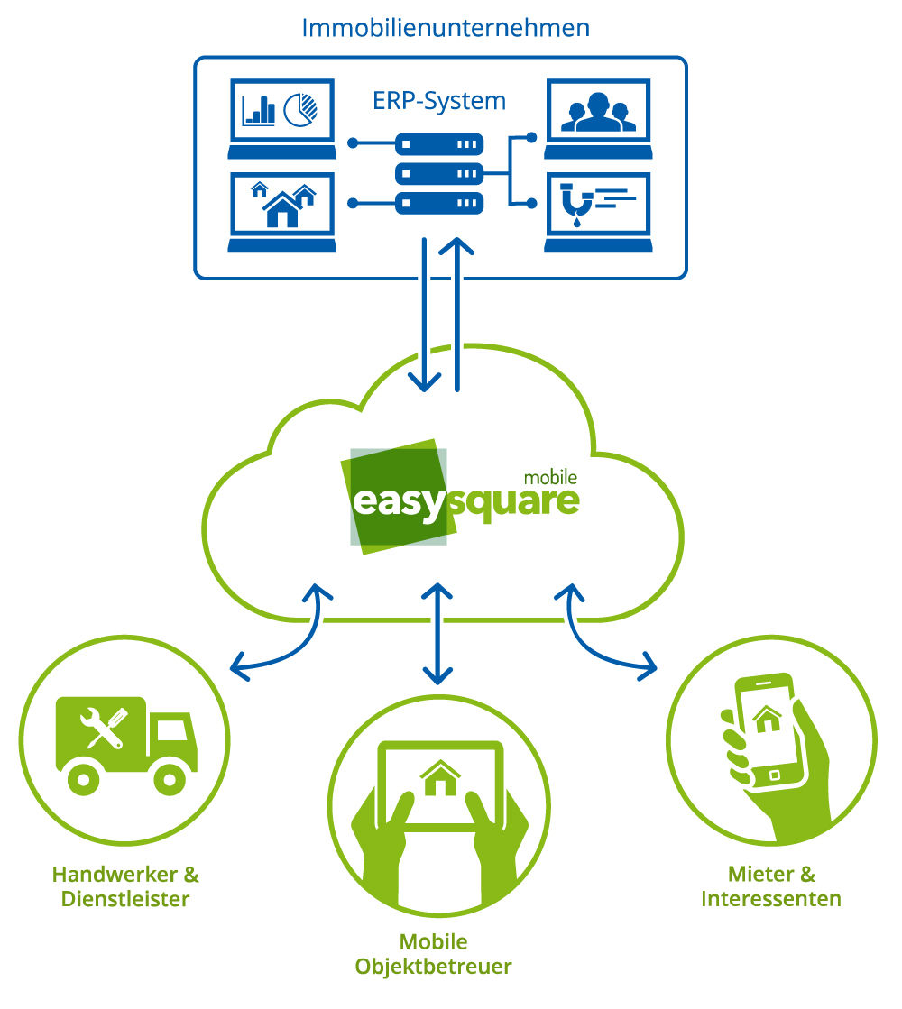 ![]() Abbildung 1: Eine intelligente Vernetzungslösung für mobile Prozesse verbindet alle Beteiligten rund um das professionelle Immobilienmanagement auf einer gemeinsamen Plattform, welche die