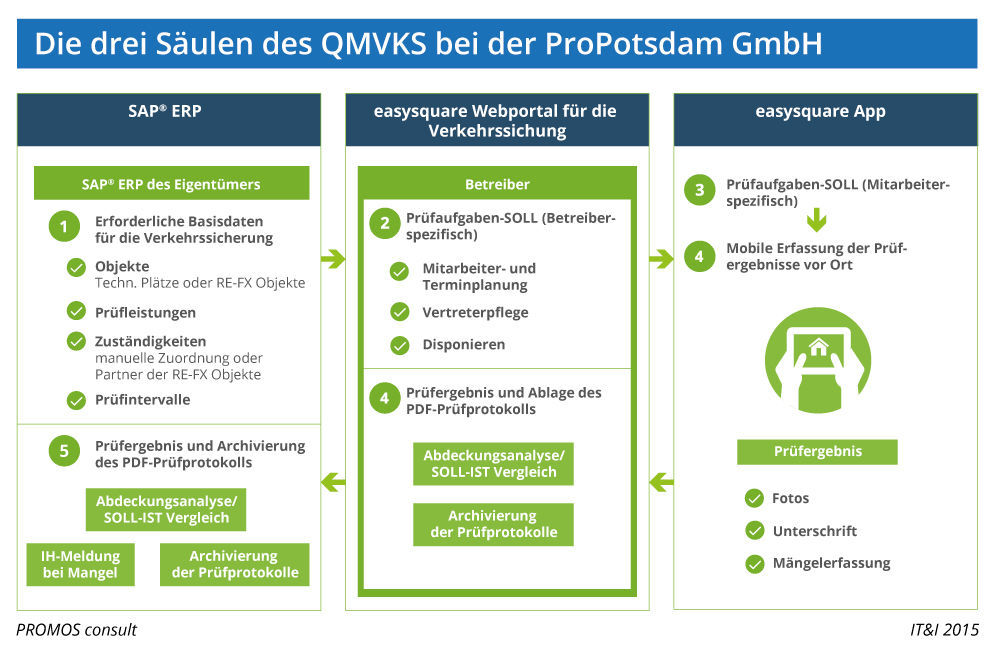 Die ProPotsdam GmbH ist das größte Wohnungsunternehmen der brandenburgischen Landeshauptstadt und deren führender Dienstleister in den Bereichen Stadtsanierung, Stadtentwicklung, Wohnungsbau und Wohnfürsorge. Insgesamt vereinigt die ProPotsdam GmbH unter ihrem Dach 11 Tochtergesellschaften. Durch innovative Konzepte und soziales Handeln trägt es zur nachhaltigen und zukunftsweisenden Entwicklung im Bau- und Wohnungssektor bei. In enger Zusammenarbeit und Abstimmung mit der PROMOS schufen die Projektverantwortlichen der ProPotsdam GmbH ein neues Konzept zur ganzheitlichen Erfüllung der Verkehrssicherungspflichten. Die Anforderungen an das neue System lagen hierbei nicht nur in einer generellen Kosten- und Aufwandsminimierung und Steigerung der Transparenz, sondern vor allem auch in der durchgehend digitalen Bearbeitung des Vorgangs mit einer Einbindung aller internen sowie externen Beteiligten und vollständiger SAP® Integration. Besonderes Augenmerk wurde zudem auf eine automatische und revisionssichere Archivierung der Prüfprotokolle gelegt, da nur so im Schadensfall eventuellen Haftungsansprüchen entgegengewirkt werden kann. Diese Prämissen dienten während der gesamten Projektlaufzeit als Ankerpunkte für die darauf aufzubauende Lösung. Das Ergebnis wurde den hohen internen Erwartungen gerecht. Die aus drei Säulen bestehende Qualitätsmanagement- und Verkehrssicherungslösung (QMVKS) auf Basis von easysquare bietet für jede Anwendergruppe das richtige Tool zur Erfüllung der jeweiligen Aufgabe: