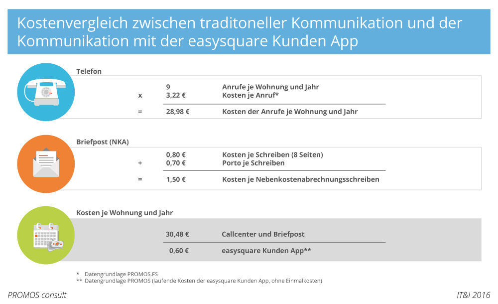 Bei einem Kostenvergleich zwischen der klassischen Kommunikation – über das Telefon und Briefpost - und der Nutzung der easysquare Kunden App werden die Einsparpotenziale überaus deutlich. Ein Anruf im Callcenter kostet im Durchschnitt 3,22 €. Erfahrungen haben gezeigt, dass durchschnittlich neun Anrufe je Wohnung und Jahr eingehen. Gerade die Terminvereinbarung zwischen Mieter und Handwerker im Reparaturprozess aber auch das Nachfragen zum Status eines Mieteranliegens führt zum typischen „Hinterhertelefonieren“. Darüber hinaus verursacht auch das Versenden von Briefen nicht unerhebliche Kosten.