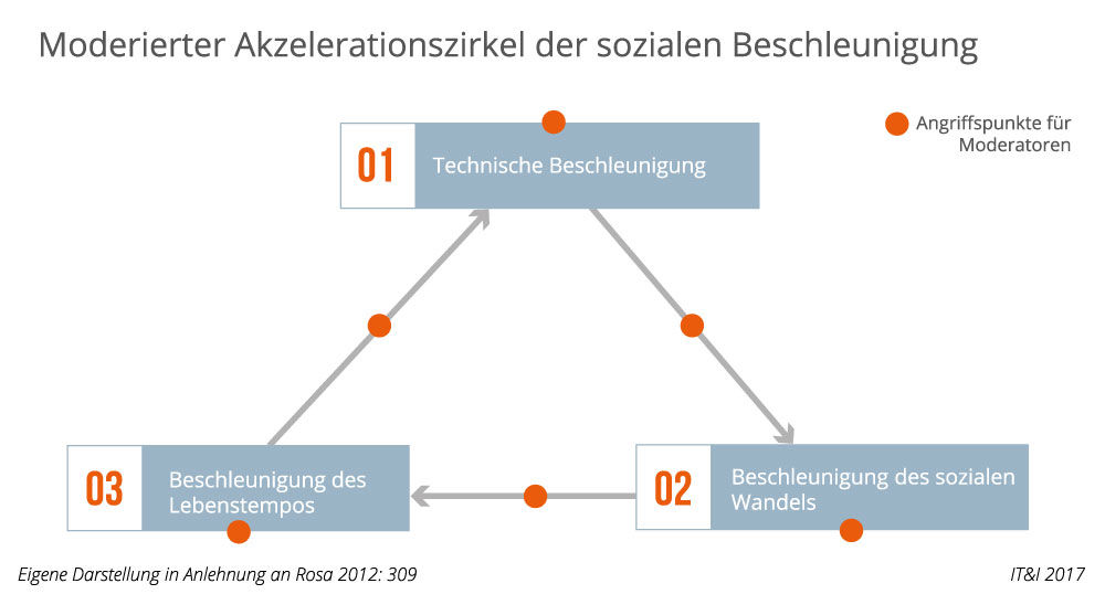 Der Akzelerationszirkel sozialer Beschleunigung besitzt die in Abbildung 2 markierten sechs Punkte, an denen Moderatoren analog dem schweren Wasser im Atomkraftwerk zu seiner Steuerung ansetzen können. Wie können derartige Moderatoren aussehen?