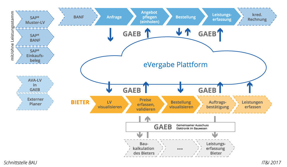 Im Netzwerk von Schnittstelle BAU und PROMOS fügt sich eine Vergabeplattform nahtlos ein, welche von Administration Intelligence (AI AG), einem in Würzburg ansässigen Kooperationspartner, entwickelt wurde. Diese modular einsetzbare Plattformlösung kann sowohl von Betreibern etablierter Ausschreibungsplattformen als auch öffentlichen Auftraggebern genutzt werden. Ihr besonderes digitales Profil ermöglicht Bekanntmachungen, eine Bieterregistrierung, Informations- und Nachrichtenfunktionen, die Mandantenfähigkeit, Signatur und Verschlüsselungen, Mantelbogenverfahren und abschließend die Angebotsabgabe. Damit wird eine eigene, rechtssichere und medienbruchfreie Vergabeplattform, basierend auf dem OSCI-Standard, sichergestellt. Das technologische Bindeglied der drei Partner ist der leistungsstarke GAEB Parser, entwickelt von Schnittstelle BAU. Er arbeitet im Hintergrund, liest, prüft und bereitet GAEB-Dateien auf, um sie im Bietertool wingaebxml anzuzeigen, liefert die aufbereiteten Daten zur reibungslosen Verarbeitung an die PROMOS SAP® GAEB Schnittstelle und validiert Angebotsdateien bei der Angebotsabgabe beim Hochladen auf eine der Vergabeplattformen mit Technologie der AI AG, zu denen bekannte Namen wie eVergabe.de, Vergabe24.de oder die seit 2016 von den Berliner Wasserbetrieben betriebene Plattform der Vergabekooperation Berlin gehören.