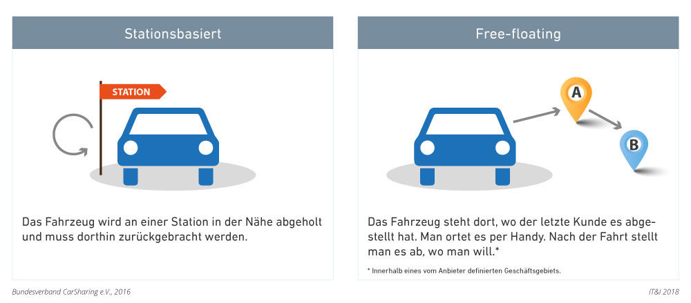 Carsharing ist das Ergebnis einer digital vernetzten Mobilität zwischen Autos und Menschen. Sie gibt es in der aktuellen Betrachtung in zwei Erscheinungsformen (Abbildung 1): Die stationsbasierten Angebote unterscheiden sich nicht wesentlich von den klassischen Autovermietungen. Nur ihre Buchungen der Fahrzeuge erfolgen online und unmittelbarer, weil man bereits registriert ist. Die Nutzungsdauer ist außerdem deutlich geringer als bei den Mietwagen. Wenn heute in den Medien von Carsharing gesprochen wird, sind damit eher die stationsunabhängigen Angebote gemeint, das sog. Free-Floating. Man sucht sich per App ein Fahrzeug in der Nähe und nach der Nutzung – das kann auch nur minutenweise erfolgen – stellt man das Fahrzeug einfach im Geschäftsgebiet wieder ab.