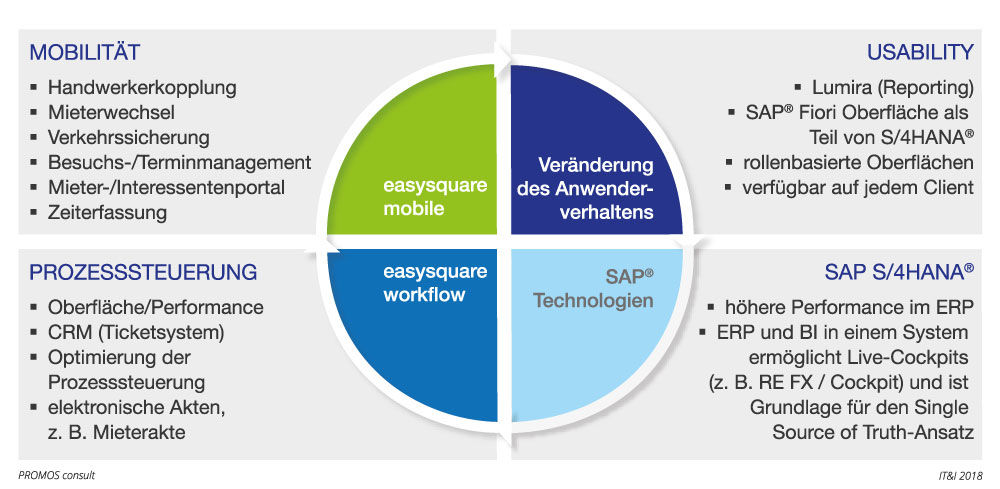 Die PROMOS Produktstrategie verfolgt das Ziel, zukünftige Entwicklungen in der digitalen Arbeitswelt, in der Immobilienbranche und bei SAP frühzeitig zu antizipieren und für unsere Kunden in praktikable und leistungsbefähigende Lösungen umzusetzen. In diesem Sinne prägen vier wesentliche Prämissen die Produktentwicklung in den kommenden Jahren: