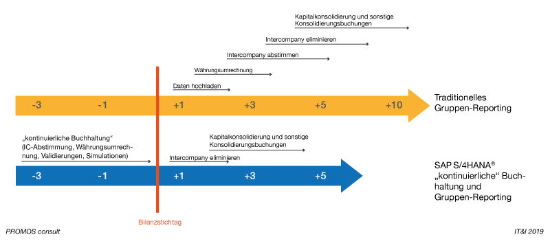 Vor dem Hintergrund, dass Finanzprognosen oder -planungen heute zudem nicht mehr nur zu festen Stichtagen erforderlich werden, sondern Unternehmen kontinuierlich Einblick in ihre Finanzsituation brauchen, ermöglicht der Fast Close samt Echtzeit-Konsolidierung in S/4HANA® eine Befreiung vom Konsolidierungs-Wahnsinn vergangener Zeiten.