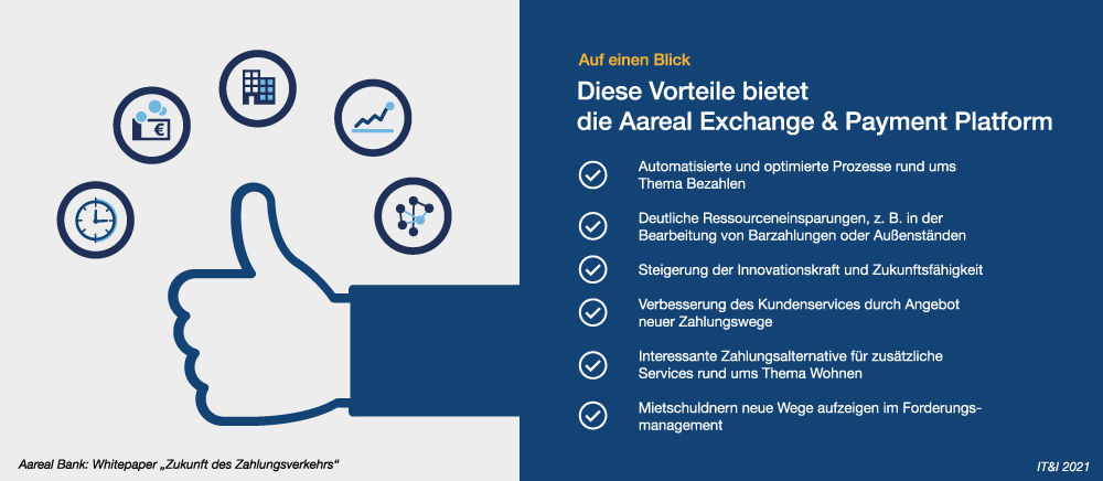 ![]() Abbildung 2: Plattformlösungen wie die Aareal Exchange & Payment Platform (AEPP) ermöglichen der Wohnungswirtschaft eine einfache Integration und Bedienung digitalen Zahlens für ihre Kunden. |