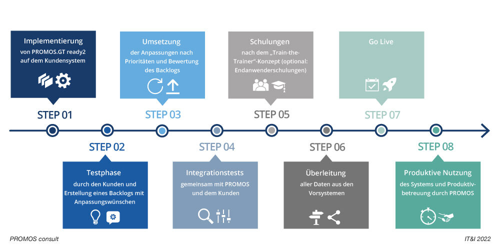 Abbildung 1: Das erweiterte Projektvorgehen für PROMOS.GT ready2 beinhaltet die Bereitstellung des fertigen Systems innerhalb weniger Wochen, um auf dessen Basis kundenindividuelle Anpassungen zu definieren. Im Standardvorgehen entfallen Schritt 02 und 03.