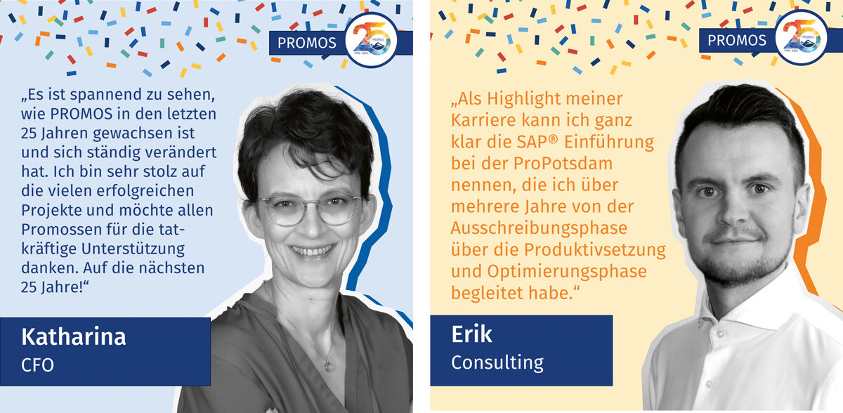 Die erfolgreichen Partnerschaften könnten schlussendlich nicht ohne die Mitarbeiterinnen und Mitarbeiter von PROMOS bestehen, von denen auch manche seit über 20 Jahren für das Berliner Beratungshaus arbeiten. Wiederum andere sind erst seit Kurzem dabei, haben jedoch bereits Beeindruckendes geleistet. Was sagen sie über PROMOS? Erik Walter arbeitet seit 10 Jahren bei dem Beratungshaus und hat seitdem viele Projekte begleitet und betreut. Eins ist Erik Walter als Head of Consulting besonders in Erinnerung geblieben: „Als Highlight meiner Karriere kann ich ganz klar die SAP® Einführung bei der ProPotsdam nennen, die ich über mehrere Jahre von der Ausschreibungsphase über die Produktivsetzung und Optimierungsphase begleitet habe. Ich habe das Projekt, welches zu einem der komplexesten und umfangreichsten der PROMOS gehört, zusammen mit unserer CFO Katharina Knorr als Projektleiter geleitet.“