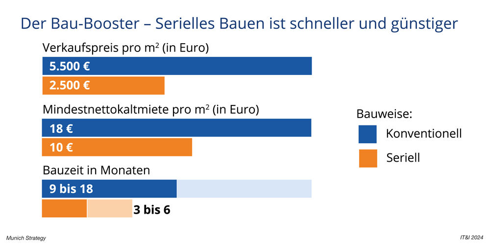 Abbildung 2: Serielles Bauen ist nach einer Auswertung von Munich Strategy deutlich schneller und günstiger.
