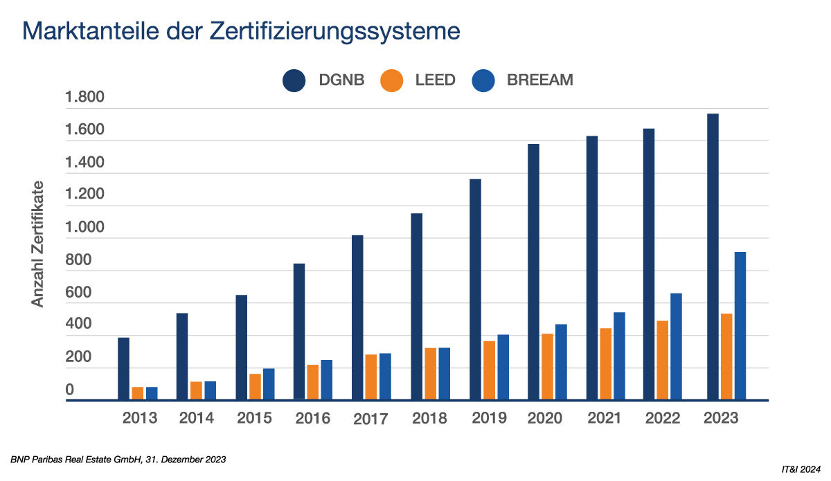 In den letzten Jahren hat das Thema Green Building enorm an Bedeutung gewonnen – nicht nur angesichts steigender Anforderungen an Nachhaltigkeit, sondern auch aufgrund der klaren wirtschaftlichen Vorteile. Green Building-Zertifikate dienen als anerkannte Qualitätsstandards, die Gebäude nach ökologischen und sozialen Kriterien bewerten. Diese Zertifikate gewinnen zunehmend an Relevanz: Während im Jahr 2013 in Deutschland nur etwa 550 Gebäude mit einem solchen Siegel ausgezeichnet waren, hat sich diese Zahl bis Ende 2022 auf beeindruckende 2.800 erhöht. Jährlich kommen somit etwa 250 neue zertifizierte Gebäude hinzu – ein klares Zeichen dafür, dass immer mehr Unternehmen auf Nachhaltigkeit setzen. Auch das finanzielle Interesse an nachhaltigen Immobilien ist stark gestiegen: Im Jahr 2022 wurden bei Transaktionen mit zertifizierten Gebäuden etwa 11,2 Mrd. Euro umgesetzt. Die Zahlen verdeutlichen, dass Green Building-Zertifikate wie DGNB, LEED und BREEAM inzwischen zu wichtigen Faktoren im Immobilienmarkt geworden sind und Unternehmen dabei unterstützen, sich im Rahmen der EU-Taxonomie und ähnlicher Regelungen nachhaltig zu positionieren.[1]