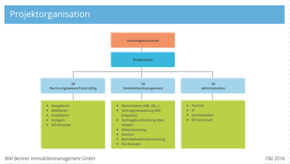 Große Hürden für das Projekt waren neben einem straffen Zeitplan und den ungleichen Systemabhängigkeiten, die unterschiedlichen Geschäftsprozesse und abweichenden Organisationsstrukturen in den beiden Unternehmen. Beispiel Geschäftsprozess: Der Liegenschaftsfonds hat sich zwischen der Übertragung der Immobilie in das Treuhandvermögen und dem Verkauf bei dem Asset Management auf das Wesentliche konzentriert. Die BIM dagegen erbringt und steuert die Komplettleistung für seine Mieter – in der Regel das Land Berlin – und arbeitet dabei eng mit Dienstleistern zusammen. Ähnlich war es bei der Organisationsstruktur. Die Mitarbeiter beim LFB waren sehr spezialisiert. Die Vertragsverwaltung war beispielsweise in Erbbau- und Sachenrecht sowie Mietverträge aufgeteilt. Die Aufgabenbereiche der BIM waren dagegen übergreifend zusammengefasst. Die unterschiedlichen Organisationsstrukturen erschwerten zu Beginn die Zusammensetzung der Arbeitsgruppen, die teilweise aus mehr als zehn Teilnehmern pro Sitzung bestanden. Ein weiterer Stolperstein war zudem, dass der vormalige IT-Dienstleister des LFB bei der Datenextraktion aus dem Vorsystem nicht mehr mitwirkte und daher diese Aufgabe komplett von der IT des LFB und dem Systemmanagement der BIM übernommen wurde.