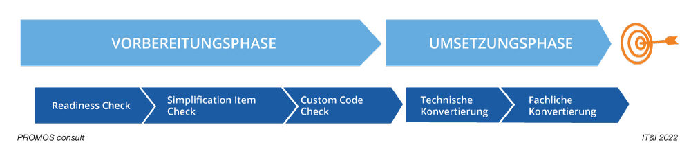 Abbildung 2: Die Migrationsstudie beinhaltete in der Vorbereitungsphase vor allem die Ausführung und Ergebnisanalyse vom Readiness Check, Simplification Item Check und Custom Code Check. Anschließend fand in der Umsetzungsphase die technische und fachliche Konvertierung statt.
