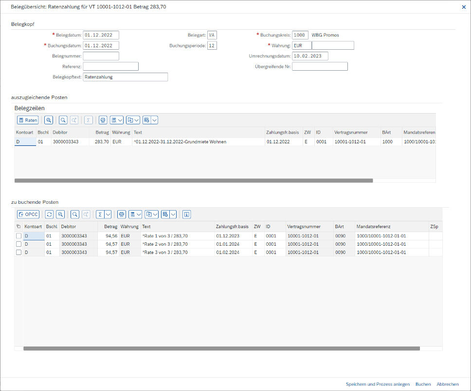 Offene Posten: Im Dialog der gespeicherten Ratenvereinbarung sind nicht nur die Raten selbst, sondern auch die zur „Verratung“ vorgesehenen offenen Posten sichtbar. Wenn die Ratenvereinbarung geändert oder gebucht werden soll, laufen im Hintergrund Prüfungen zur Statusüberwachung der offenen Posten.