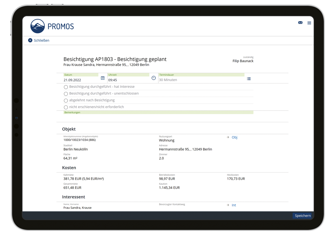 Besichtigungen: Durch den Einsatz der easysquare Lösung auf mobilen Endgeräten können Besichtigungen mittels vorliegender Interessentendaten und Checklisten vor Ort perfekt begleitet werden.