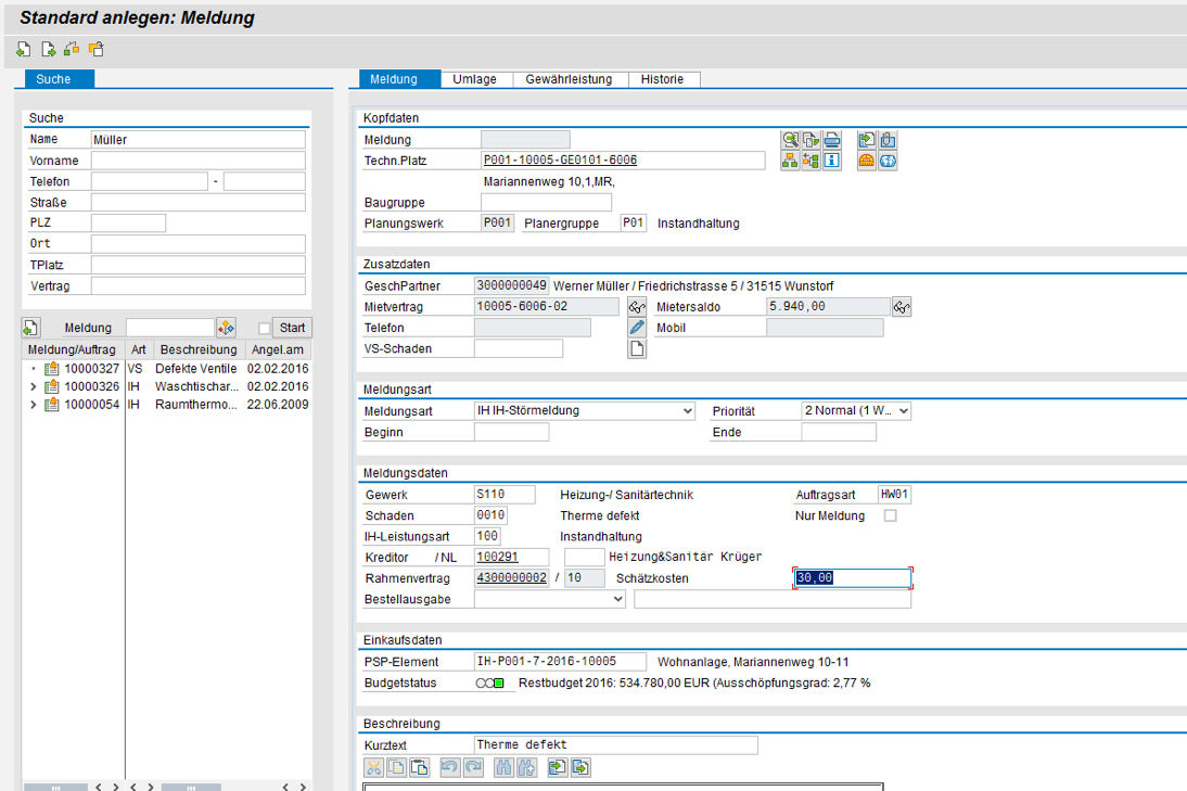 Beim Eingang einer neuen Meldung durch den Mieter kann der Kundenbetreuer zunächst über die in die Schnellerfassungsmaske integrierte Suchfunktion, die Daten des jeweiligen Mieters aufrufen. Es werden sofort alle relevanten Daten angezeigt, so z. B. die gesamte Historie zum Technischen Platz und der übergeordneten Objekte. Ebenso kann die Adresse des Mieters in Google Maps angezeigt werden. Der Kundenbetreuer hat nun die Möglichkeit, bei Bedarf die Stammdaten des Mieters zu aktualisieren. Zusatzinformationen, wie der aktuelle Mietsaldo, erlauben es, den telefonischen Mieterkontakt zu nutzen, um beispielsweise auf eventuelle Zahlungsrückstände hinzuweisen.