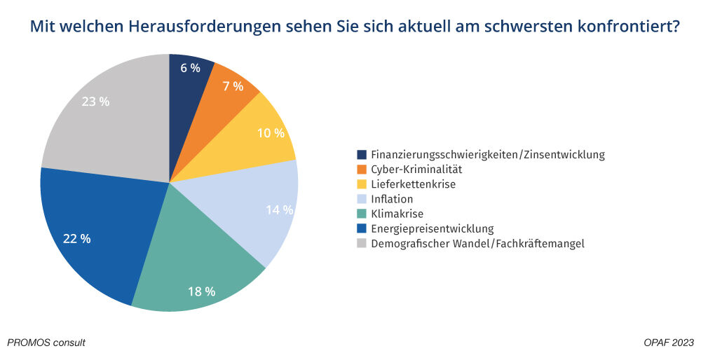 ![]() Abbildung 1: 23 Prozent der Befragten OPAF Teilnehmenden sehen den demografischen Wandel bzw. Fachkräftemangel als aktuell größte Herausforderung. (n=104) |