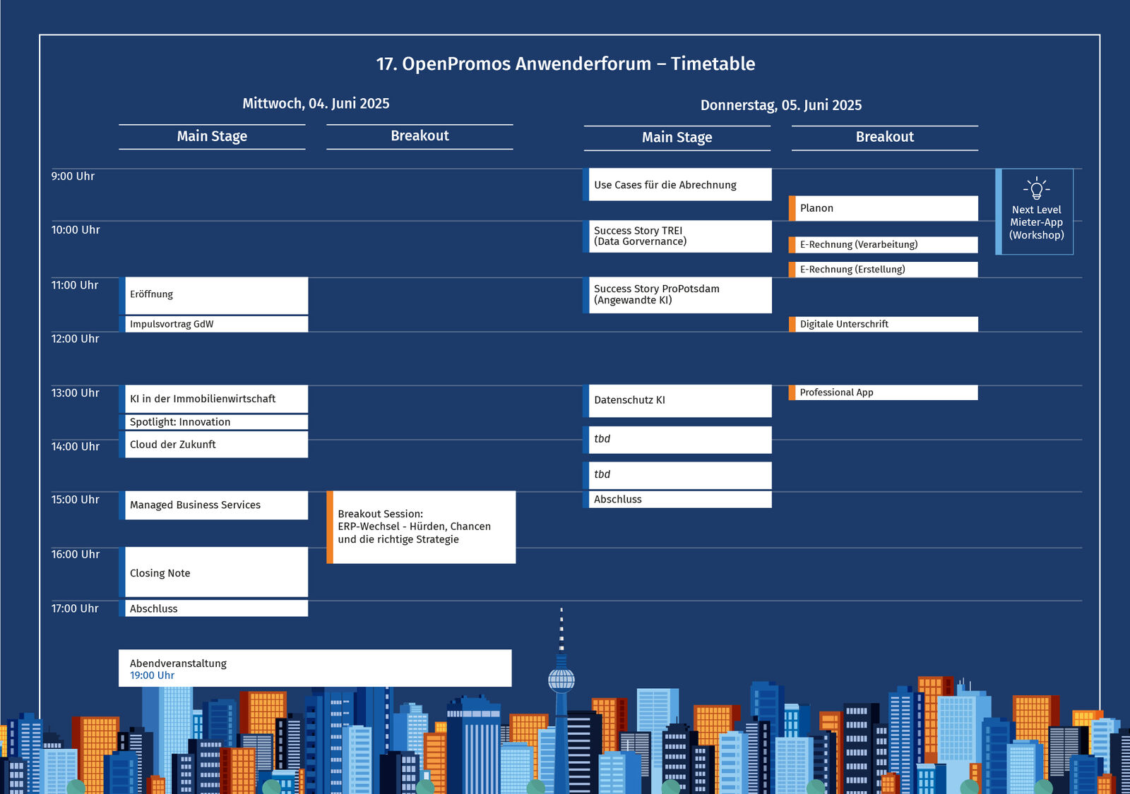 Wir bringen unsere Fokusthemen in unterschiedliche Formate. Damit jeder das findet, was ihn weiterbringt. Künstliche Intelligenz etwa wird sowohl strategisch als auch praktisch beleuchtet: Am ersten Tag geht es um die Richtung, die wir bei PROMOS einschlagen und welche Lösungen schon konkret in Arbeit sind. Am zweiten Tag geht es in die Praxis: ProPotsdam berichtet aus dem Projekt sowie dem Einsatz ihrer KI-Lösung in der Praxis. Außerdem können individuelle Fragen an Nida Kizilaslan in der Innovation Lounge gestellt werden. Ergänzend werden auch rechtliche Aspekte beim Einsatz von KI behandelt – ein Thema, das in der Praxis oft (zu Unrecht?) gefürchtet wird.