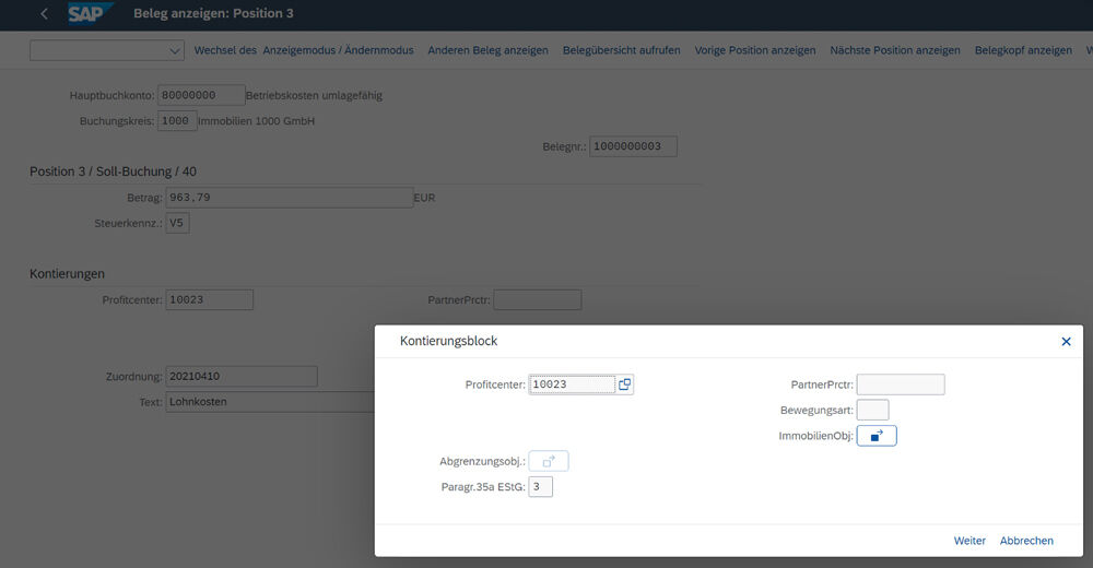 Im SAP® werden alle Kosten, die Betriebskosten darstellen und im Rahmen der Nebenkostenabrechnung umgelegt werden, auf Abrechnungseinheiten gebucht. PROMOS hat in den Buchungsbeleg das zusätzliche Feld „Paragraph 35 EStG-Haushaltsnahe Dienstleistung“ eingebettet, mit dessen Hilfe Lohnkosten direkt beim Buchen als solche gekennzeichnet werden können. Hierbei wird über eine Katalogauswahl die Art der Lohnleistung klassifiziert, z. B. „Haushaltsnahe Dienstleistungen“ oder „Handwerkerleistungen“.