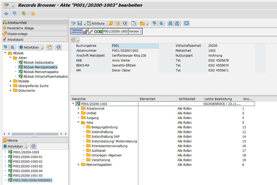 Die baumartige Struktur der Vertragsakte bildet die Grundlage einer übersichtlichen Darstellung. Diese wird im Rahmen des Einführungsprojektes kundenindividuell besprochen und umgesetzt. Dabei werden auf Best Practices der PROMOS zurückgegriffen. Definiert wird an dieser Stelle, welche Inhalte sich an welcher Stelle der jeweiligen Akte befinden sollen und dort automatisiert abgelegt werden. Absprünge in SAP® Transaktionen oder in für die Akte relevante Objekte, wie z. B. das Mietobjekt und eventuelle Unterakten, sind mit einem Klick möglich.
