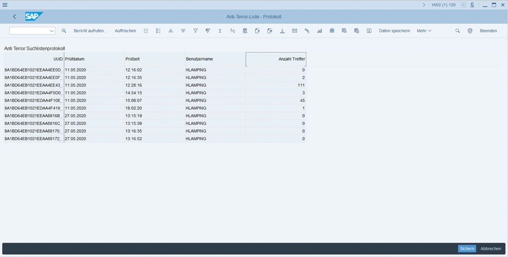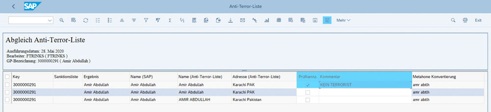 Zum einen kann der Anwender mittels der Einzelfallprüfung den entsprechenden Geschäftspartner abrufen und hinsichtlich einer möglichen Übereinstimmung mit den Sanktionslisten abgleichen. Als Ergebnis seiner Abfrage erhält der Anwender eine Liste mit Treffern. Diese Prüfung wird automatisch protokolliert und steht als Nachweis dauerhaft im SAP® System zur Verfügung.