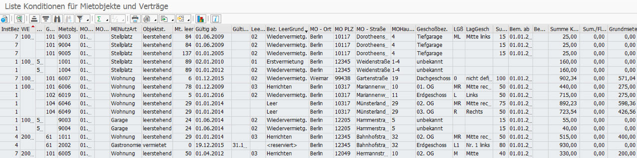 Diese Reports erweitern das SAP® Standard Auswertungsspektrum im RE-FX deutlich. In diesen Reports werden Daten aufbereitet und kombiniert, welche sonst aus verschiedenen Standard Reports von SAP® manuell zusammengetragen werden müssten. Hierzu zählt beispielsweise die Belegungsliste, welche die Daten von Mietobjekten und Verträgen miteinander kombiniert.