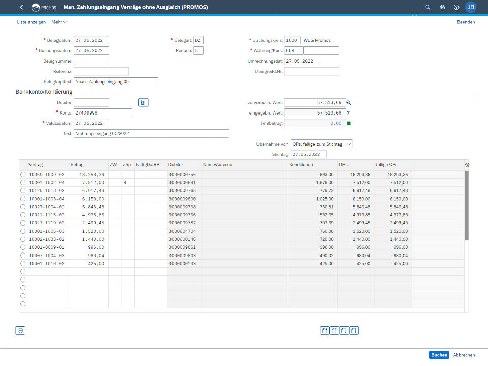 - Integration in die Vertragsdaten: Die Funktion ist in das PROMOS Vertragskontenblatt integriert. Erfolgt der Aufruf von hier, werden Vertrags- und Partnerdaten vom jeweiligen Vertrag automatisch vorbelegt. Verfügt ein Mieter über mehrere Verträge, lassen sich diese anhand der Debitorennummer automatisch ermitteln, so dass eine Betragsaufteilung auf mehrere Verträge vorgenommen werden kann.