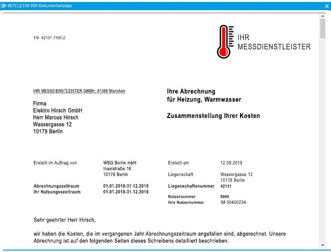 Messdienstleister erstellen die Heizkostenabrechnung und übermitteln die Ergebnissätze für die automatisierte Übernahme elektronisch an das Wohnungsunternehmen, welches die Daten in sein SAP® System einspielt. Neben den Ergebnissen im Dateiformat DTTECD können die Wärmemessdienste ergänzende Informationen des Abrechnungsschreibens ihrerseits als einzelne PDF-Dateien pro Mieter inklusive einer Indexdatei im Format DTTECE (Satzart E898) zur Verfügung stellen.