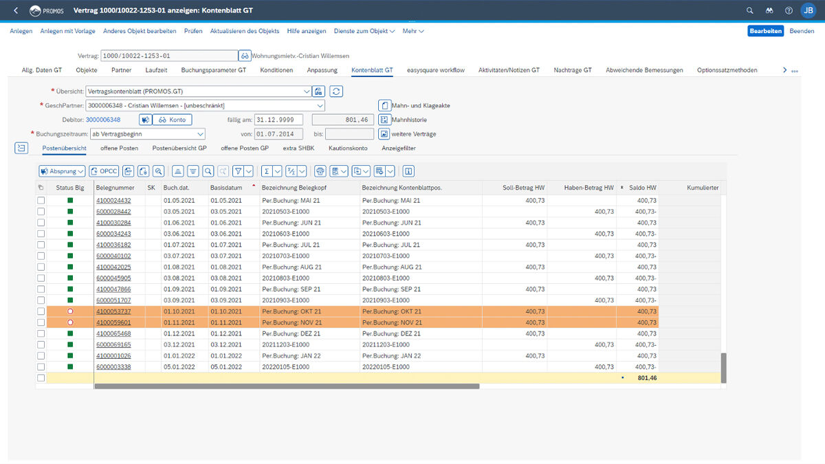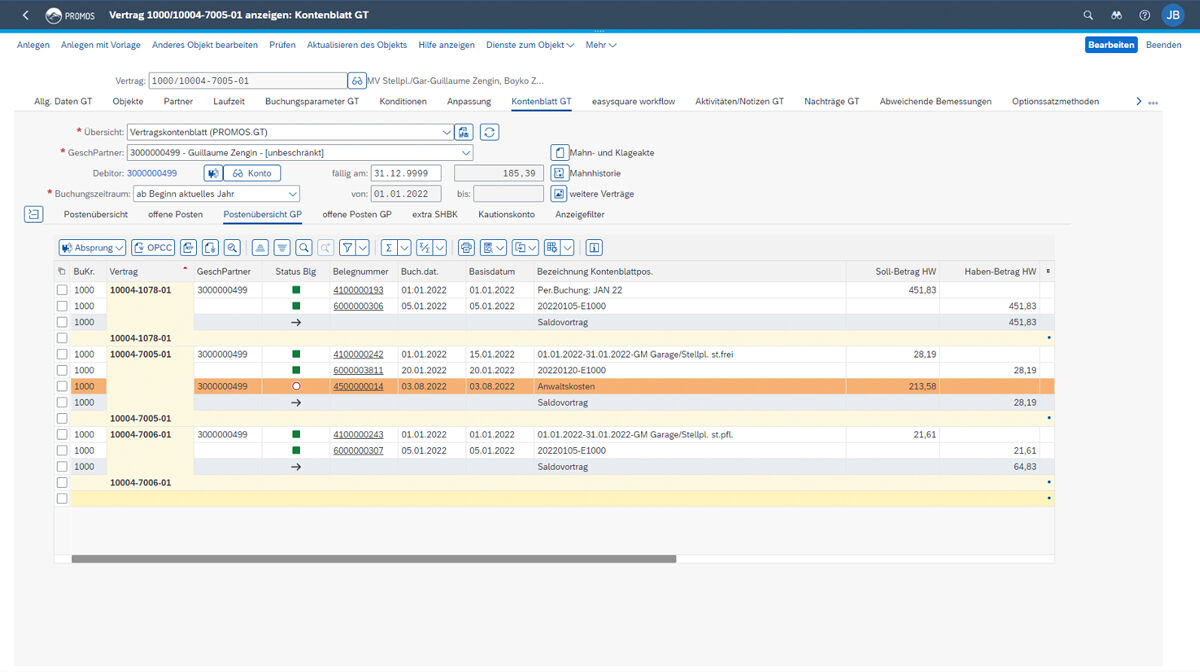 Postenübersicht / GP: In der Postenübersicht GP werden alle Buchungen des Geschäftspartners komprimiert und gruppiert nach den einzelnen Verträgen dargestellt, wobei Zwischensummen pro Monat berechnet werden und der Saldo kumuliert fortgeführt wird. Eine Ampelfunktion kennzeichnet bereits ausgeglichene Belege grün, noch offene Belege rot. Zu Letzteren können zusätzlich alle Informationen des Mahnwesens abgerufen werden.