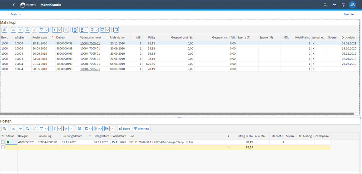 ![]() Die Mahnhistorie gibt Auskunft über die Anzahl derMahnungen und die darin enthaltenen offenen Posten.  |