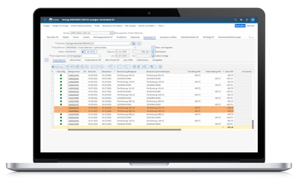 Postenübersicht / GP: In der Postenübersicht GP werden alle Buchungen des Geschäftspartners komprimiert und gruppiert nach den einzelnen Verträgen dargestellt, wobei Zwischensummen pro Monat berechnet werden und der Saldo kumuliert fortgeführt wird. Eine Ampelfunktion kennzeichnet bereits ausgeglichene Belege grün, noch offene Belege rot. Zu Letzteren können zusätzlich alle Informationen des Mahnwesens abgerufen werden.