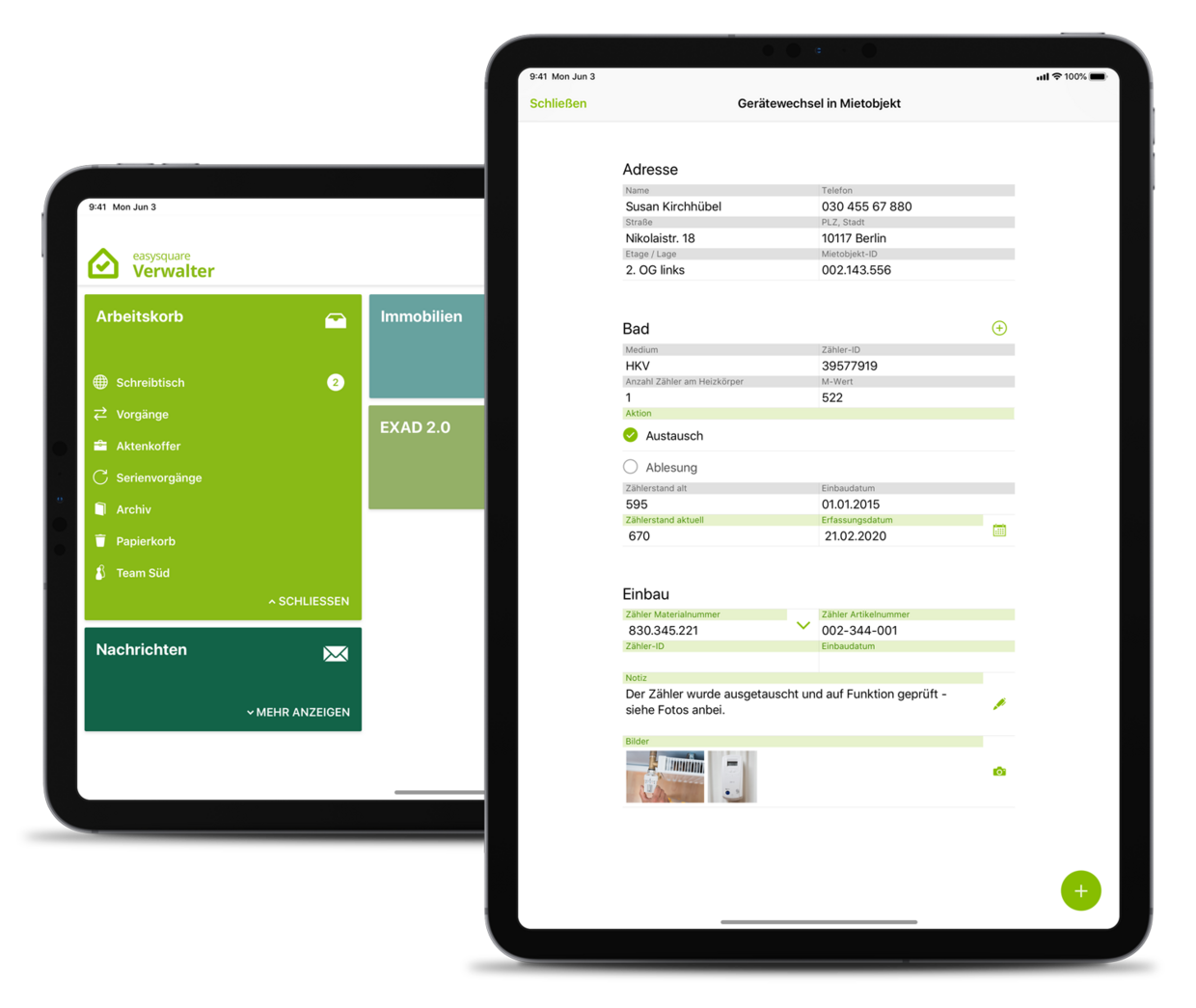 Die mobile Datenerfassung für den Gerätewechsel in der easysquare App vor Ort inklusive der Integration in das jeweilige ERP-System des Wohnungsunternehmens erfolgt schnell, effizient und ohne Medienbrüche.