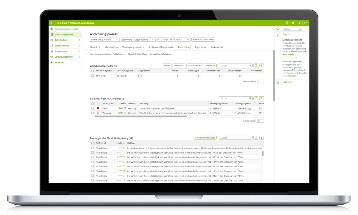Zur Unterstützung der korrekten Arbeitsweise lassen sich Stamm- und Bewegungsdaten auf Fehler und Inkonsistenzen prüfen. Für jeden Prozessschritt stehen modulare Verfahren zur Analyse bereit. Zusätzlich werden in der Fehlerprüfung auch Plausibilitätsprobleme aufgelistet, indem bspw. auf eine starke Abweichung des Verbrauches zum Vorjahr hingewiesen wird. Bewegungsdaten, wie Ablesewerte, Verbräuche oder Kosten, können in Relation zueinander gesetzt werden. Die Ergebnisse lassen sich so individuell aufbereiten.