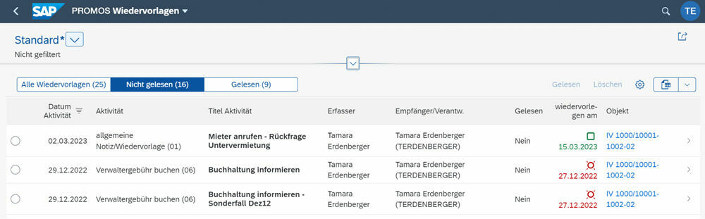Einfachheit: Die PROMOS Wiedervorlagen für SAP Fiori® ermöglichen die schnelle Verwaltung von Wiedervorlagen über alle RE-Daten hinweg.