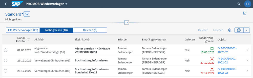 Einfachheit: Die PROMOS Wiedervorlagen für SAP Fiori® ermöglichen die schnelle Verwaltung von Wiedervorlagen über alle RE-Daten hinweg.