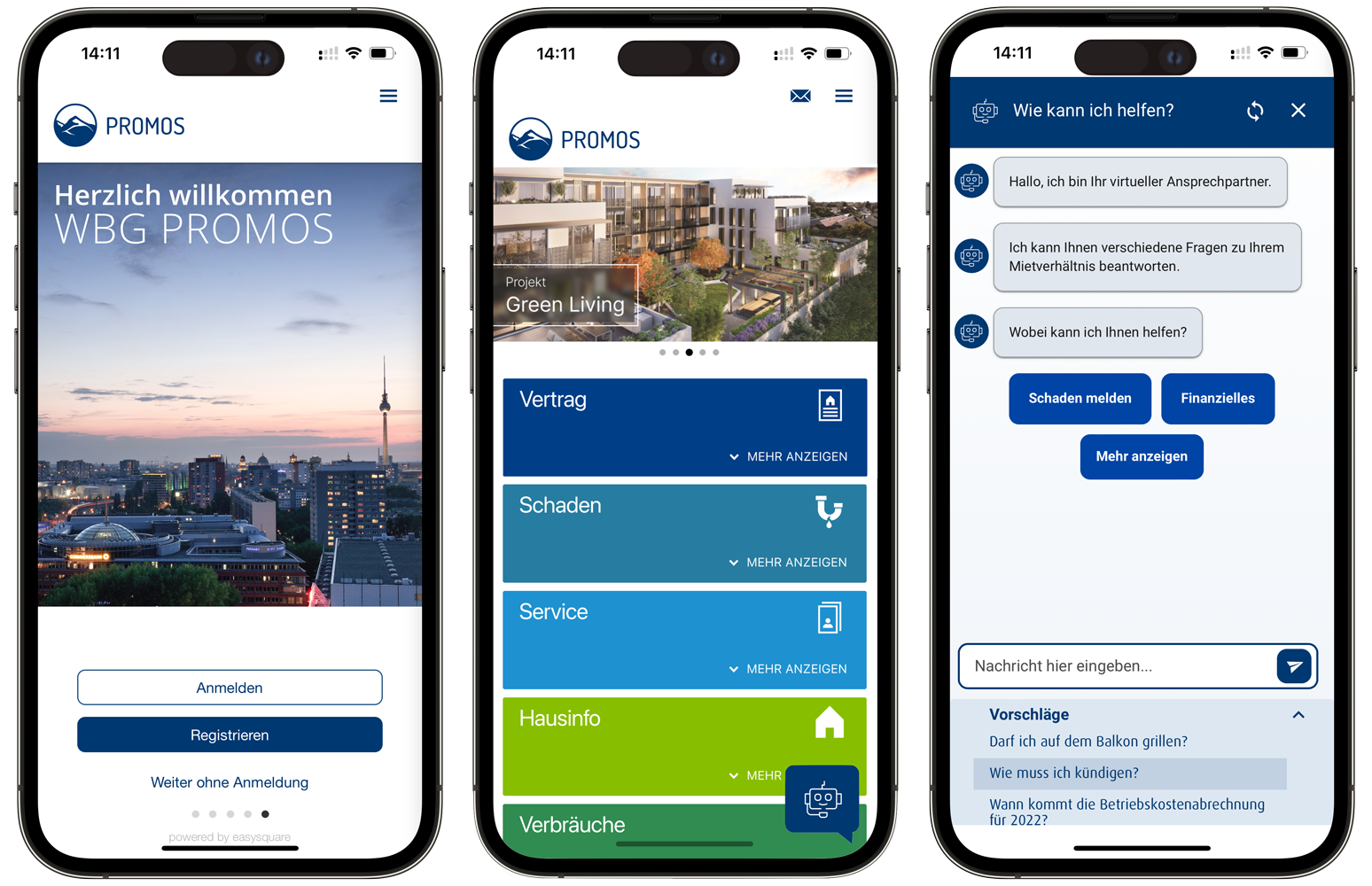 |  Übersicht der vielfältigen Dienste in der easysquare Mieter-App – komplettiert durch eine optionale Chatbotfunktion mit unseren virtuellen Assistenten PROMi. |