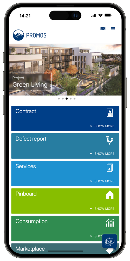 Übersicht der vielfältigen Dienste in der easysquare Mieter-App – komplettiert durch eine optionale Chatbotfunktion mit unseren virtuellen Assistenten PROMi.